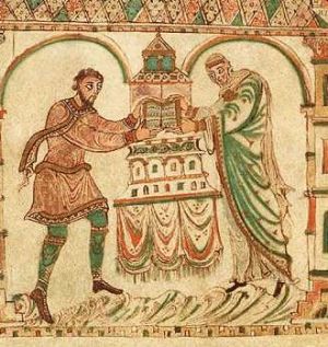 Dirk en Hildegard schenken een evangelarium aan de abdij van Egmond (afbeelding uit dat evangelarium zelf)